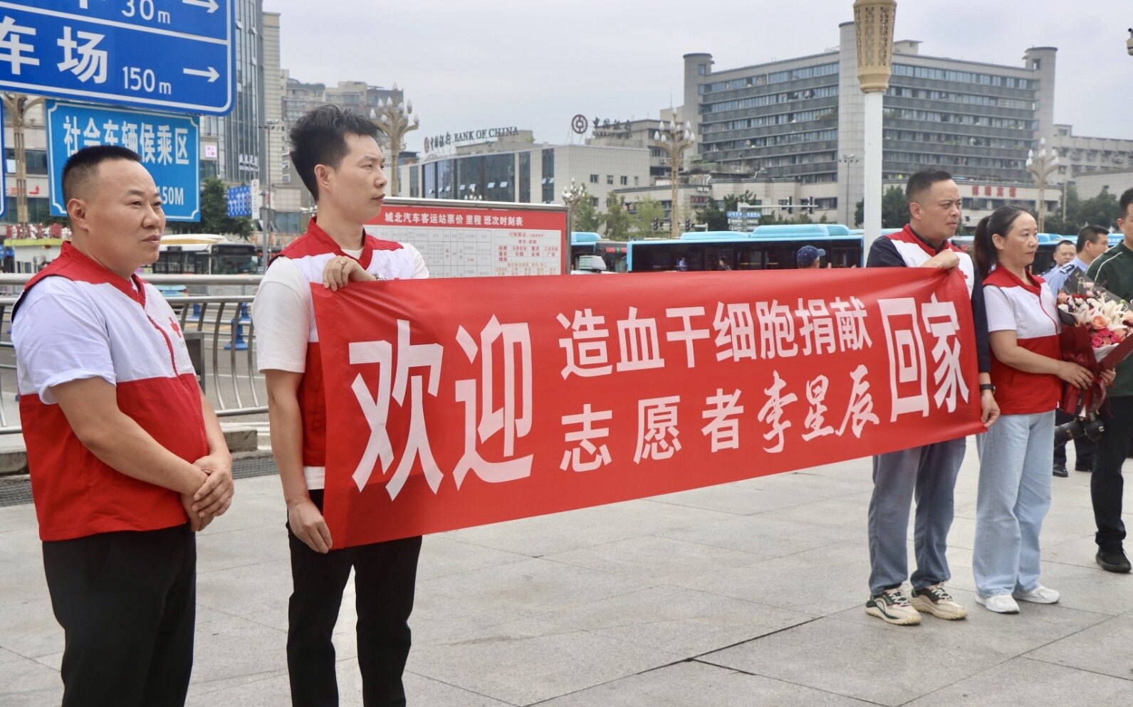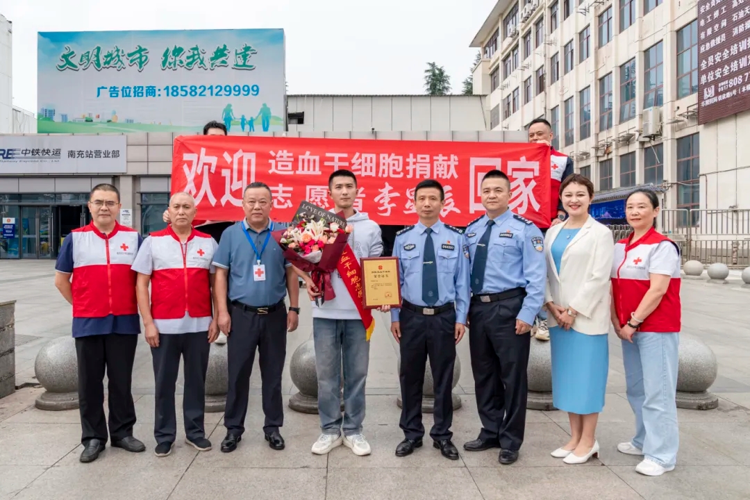 南充市、顺庆区红十字会的职责主说念主员和共事们“原宥造血干细胞捐献志愿者李星辰回家”。(拍摄:陈静)