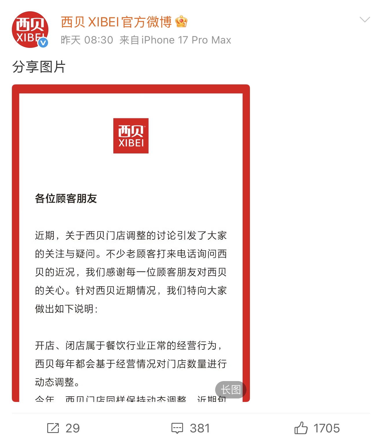 有媒体称,西贝在世界出现了“闭店潮”,关闭门店包括苏州似锦中心店、北京石景山京西珠宝城店、汕头万象城店、南京天下欢畅港店、深圳西丽万科云城店、长沙富兴时期店、重庆不雅音桥店等。