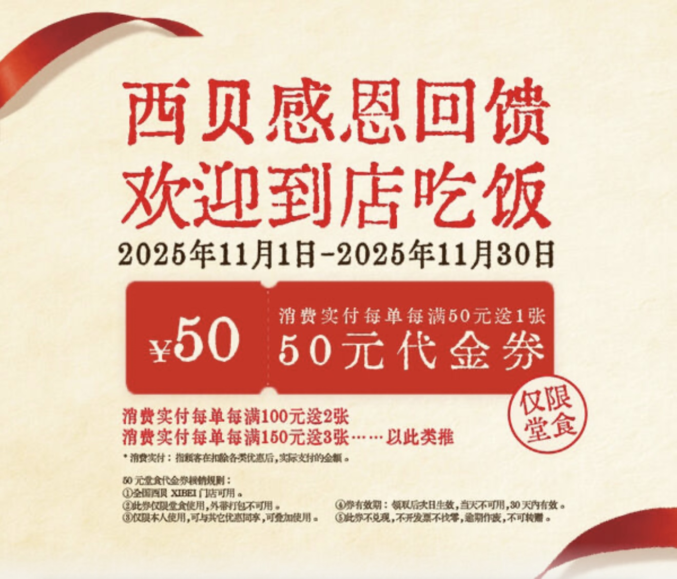 10月9日,西贝再次加码“满50元送50元券”行径,此举之后,部分门店以致出现火爆列队的局势。11月7日,行径还在不竭,西贝公众号发文称“到店破费实付每满50元送50元”,有用期至11月30日。